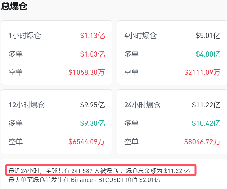 Coinglass数据显示,过去的24小时内,加密货币市场全网合约爆仓11.22亿美元,爆仓人数达到24万人,其中92%为多单爆仓。最大单笔爆仓单发生在Binance—BTCUSDT,价值2亿美元。
