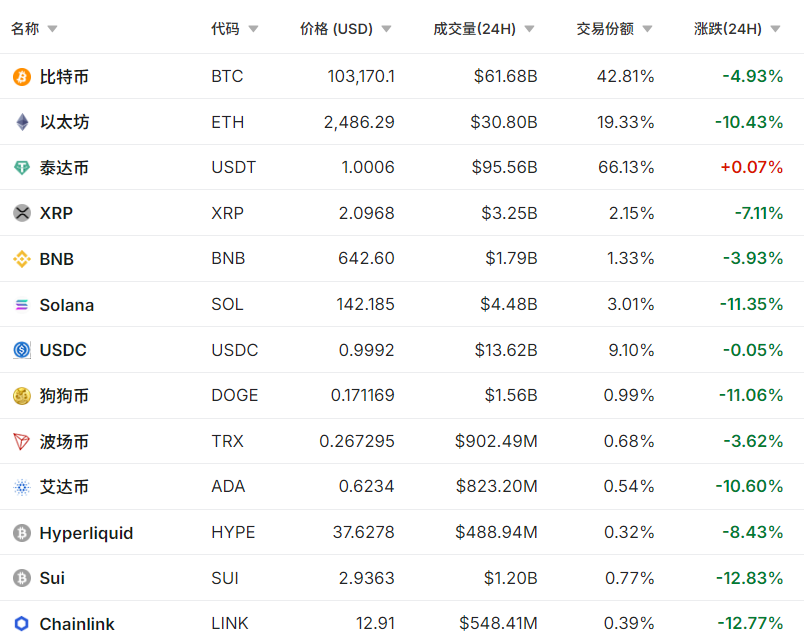 截至券商中国记者发稿,比特币下跌4.93%报10.3万美元,以太坊跌10.43%报2486美元。另外,BNB跌近4%,XRP跌超7%,Solana、狗狗币、艾达币跌幅均超过10%。